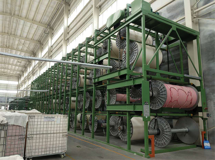 經(jīng)軸染色機(jī)(BEAM)將織物卷于多孔滾筒的卷軸之上,裝填于壓力